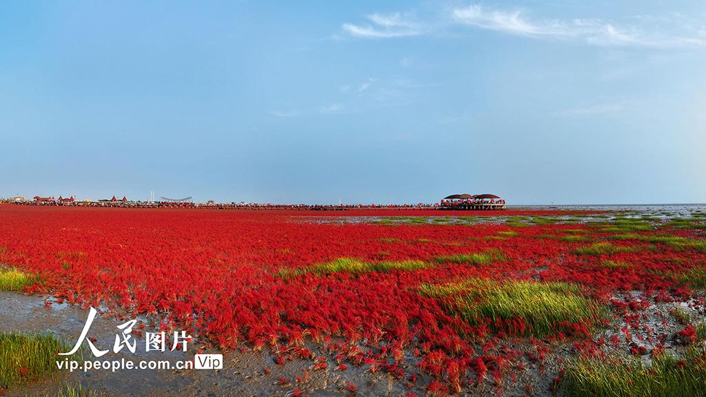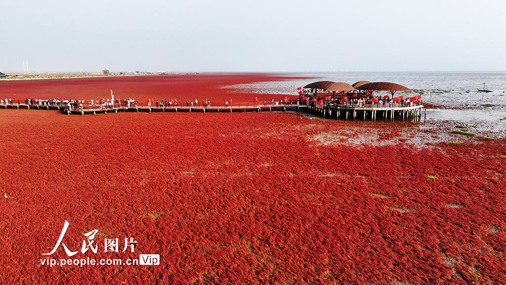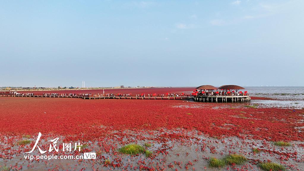 国庆假日期间,辽宁省盘锦市红海滩国家风景廊道,万亩碱蓬草织就的“红地毯”吸引大批游客前来观光游览,尽享生态美景。韩颖群摄(人民图片网)
