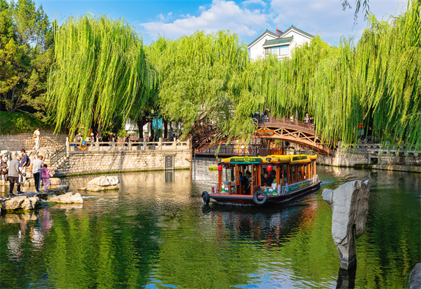 待日色渐明,黑虎泉码头的新能源游船已披着晨雾待发。选一艘画舫造型的游船,“矿泉水上坐游船”启程的刹那,护城河便成了流动的画卷。船过泉城广场,看朝阳为“泉标”镀上金边;行至趵突泉段,隔窗望见三股泉眼腾起的水雾,在晨光中幻作七色虹霓,恍若“趵突腾空”的盛景为游船独演。这一程,泉是眼,船是笔,而你,早已成了画中人。