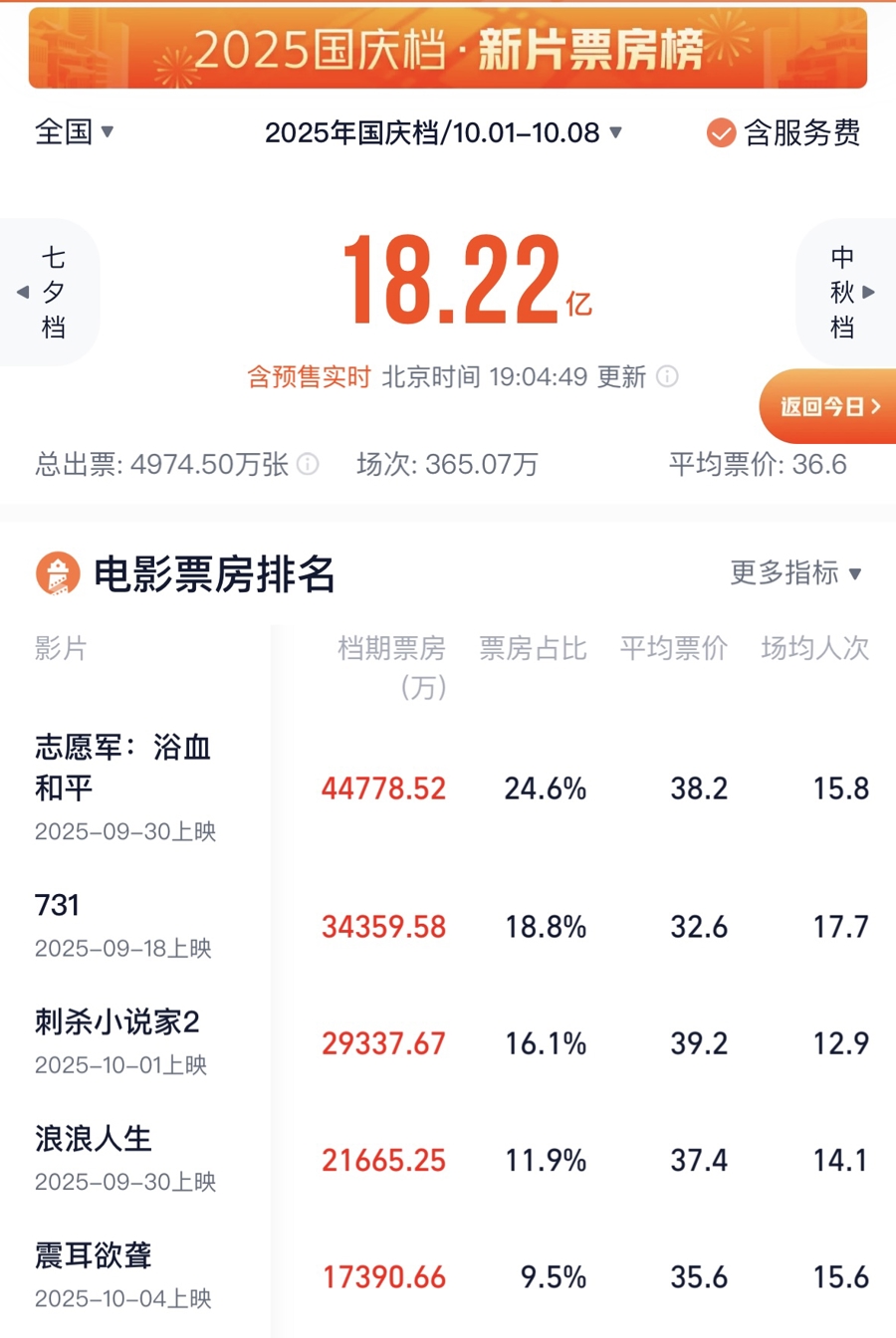 截至北京时间10月8日19时,国庆档票房超18.20亿元